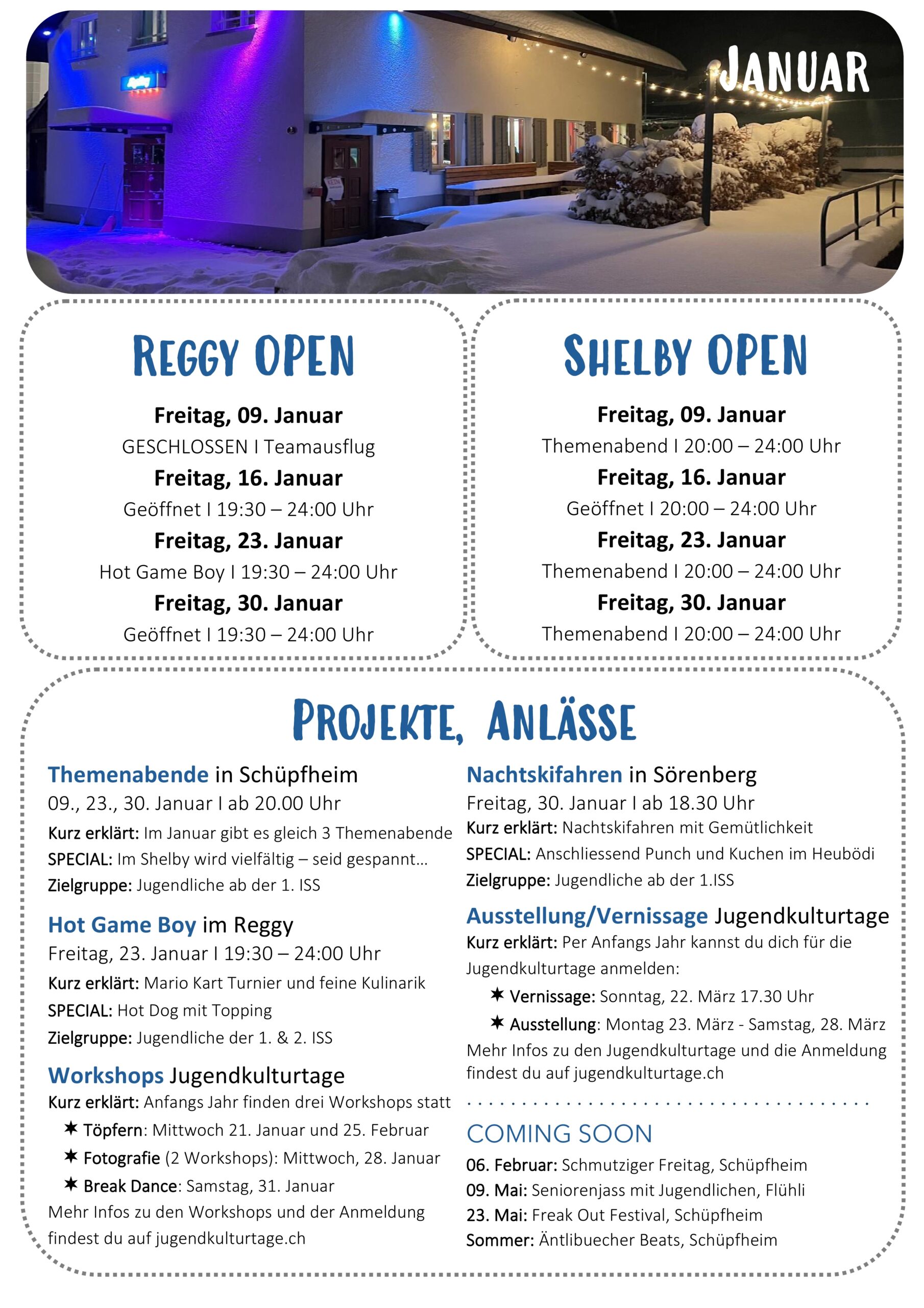 Die beiden Jugendtreffs Reggy und Shelby sowie die Jugendbüros in Schüpfheim und Flühli bleiben über die Weihnachtsferien geschlossen. Am Freitag, 09. Januar öffnet das Shelby wieder seine Türen. Das Reggyteam startet mit einem Ausflug ins Neue Jahr Das Reggy öffnet wieder am Freitag, 16. Januar. Wir wünschen ein besinnliches Weihnachtsfest und ein frohes neues Jahr. Es freut uns riesig, für euch alle im neuen Jahr da zu sein.